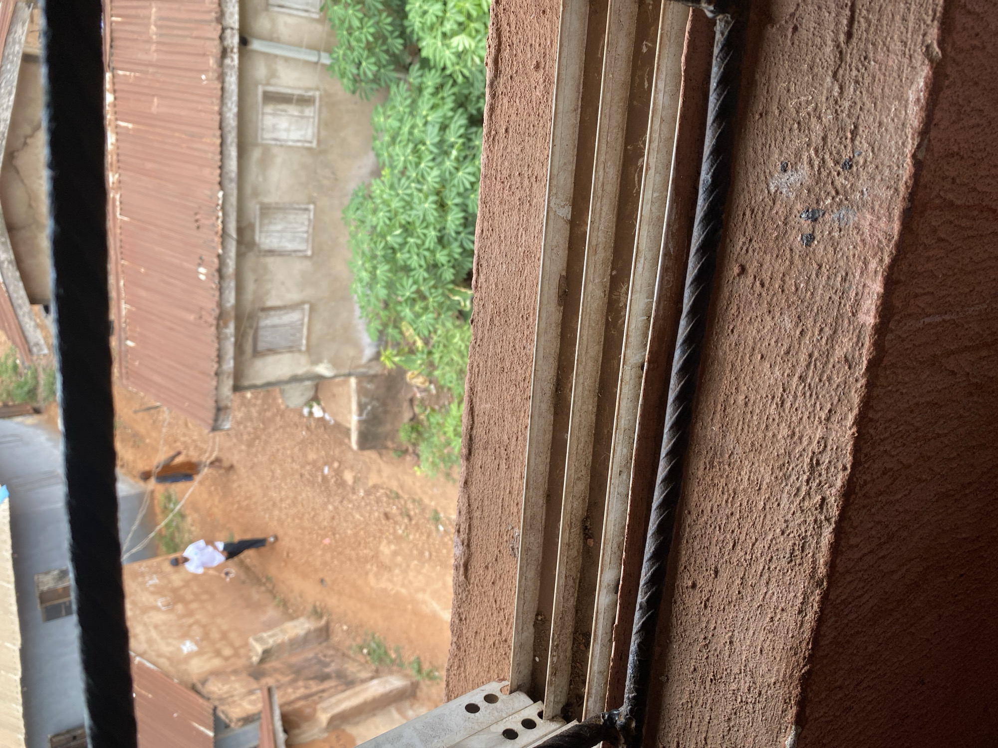 n elevated view from a window overlooking an outdoor scene in Nsukka, Nigeria. The foreground features a window frame, with details of its metal slats and the rough texture of the surrounding wall. Beyond the window, the scene reveals a partially obscured view of a complex of buildings with corrugated iron roofs. A dirt courtyard lies between the buildings. Two people are visible in the courtyard: one wearing a white shirt and dark pants and lying on the ground, and the other is standing nearby. Lush green foliage partially covers the view of one of the buildings. The overall impression is of an area with simple structures and natural elements.