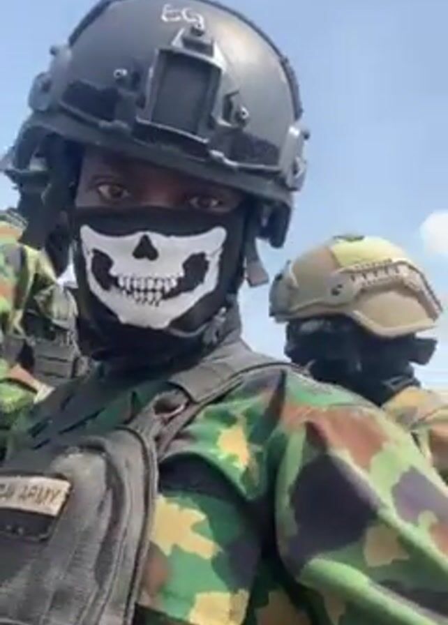 soldier wearing a helmet, a camouflage uniform, and a face mask with a skull design. The soldier is on a boat, moving across a body of water. Other soldiers, similarly attired, are visible on the boat. The soldier is holding a camera or phone, recording the scene. The patch on the vest reads “NIGERIAN ARMY”. The environment includes water, sky, and distant vegetation.