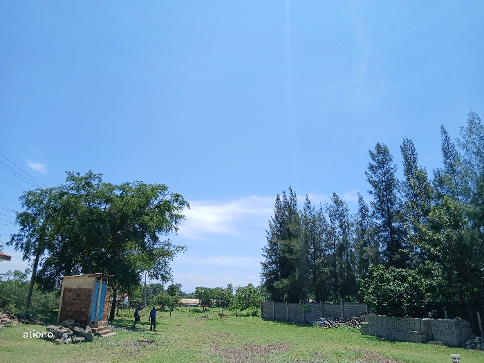The image depicts an outdoor scene in Kisumu, Kenya, under a clear blue sky with minimal white clouds