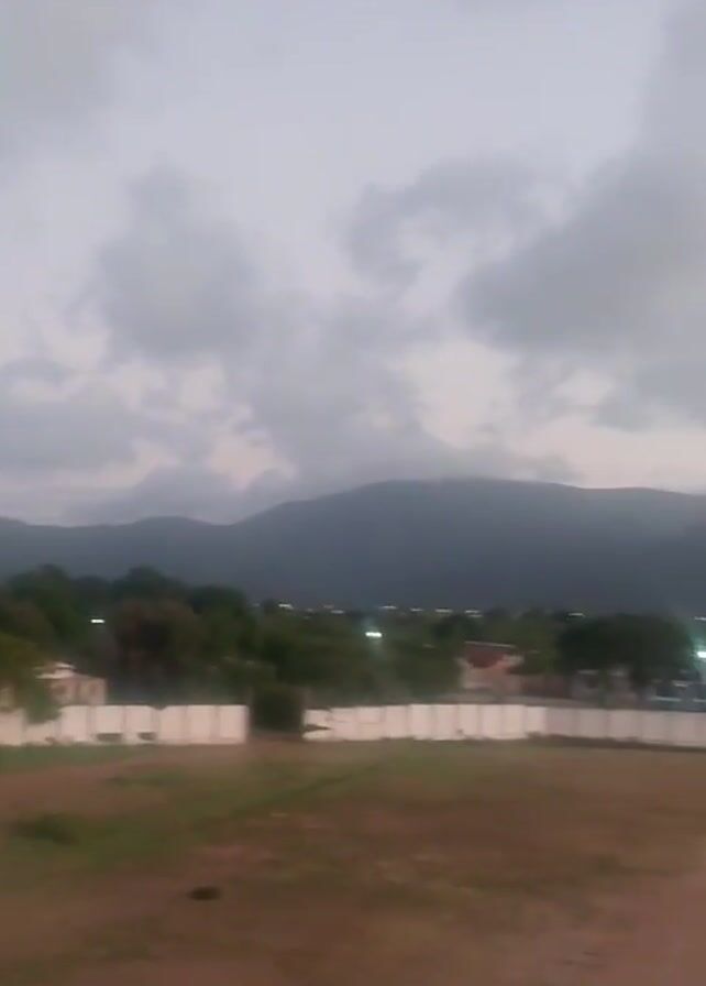 view of a mountainous landscape under a cloudy sky, transitioning into dusk or early evening. In the foreground, there is a field or open area, possibly a sports ground, with a white perimeter fence. Scattered trees are visible, along with some buildings. As the video progresses, the sky brightens slightly, revealing a hint of pink on the horizon. The lights of a distant town or settlement become more visible, twinkling in the distance against the backdrop of the mountains. The camera appears to be stationary and indoors, filming through a window or opening. The text "Infinix SMART 8" is visible in the bottom left corner of the screen, indicating the device used to record the video.