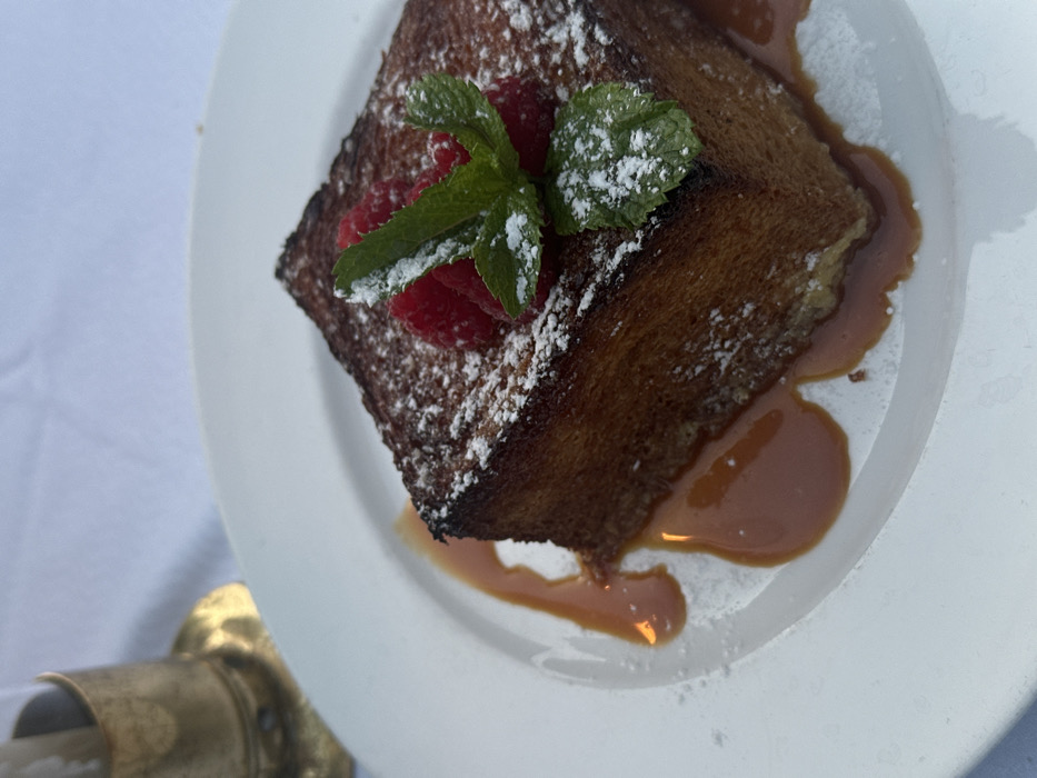 - "An close-up, elevated view captures a thick, square-cut slice of golden-brown French toast centered on a white, round plate" by FM-kpSlz1, licensed under CC BY 4.0