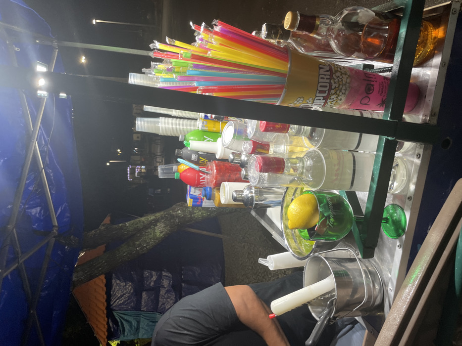 - "A bar cart is stocked with alcohol, juices, plastic cups, and a bundle of colorful straws in a popcorn bucket" by FM-yU2qz2, licensed under CC BY 4.0