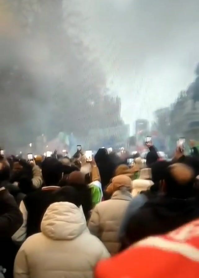 large crowd of people gathered on a street. Many people are holding up their phones, seemingly to record or photograph the scene. There is smoke in the air. Flags are visible in the crowd, including one that appears to be an Iranian flag and one that appears to be an American flag. In the background, there is a statue on a horse. The scene appears to be a demonstration or protest.