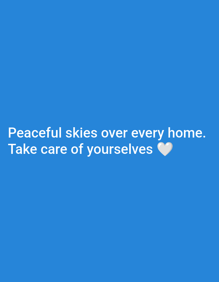 The image displays a digital graphic set against a uniform, solid blue background, associated with the city of Lviv, Ukraine. Centrally positioned in the lower-middle portion are two lines of white, sans-serif text. The first line states: 'Peaceful skies over every home.' The second line reads: 'Take care of yourselves ❤️', concluding with a light grey heart emoji. No specific individuals, physical objects, actions, interactions, or environmental details of Lviv are visually depicted within this graphic.