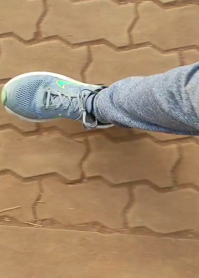 A person in grey sweatpants and light blue sneakers walks along a sidewalk paved with brown, interlocking bricks. The camera, positioned from the perspective of the walker, focuses on their feet and the ground. The sidewalk appears to be slightly worn and uneven. Some small twigs and debris are scattered on the surface. The person continues to walk at a steady pace, their steps visible in the frame.