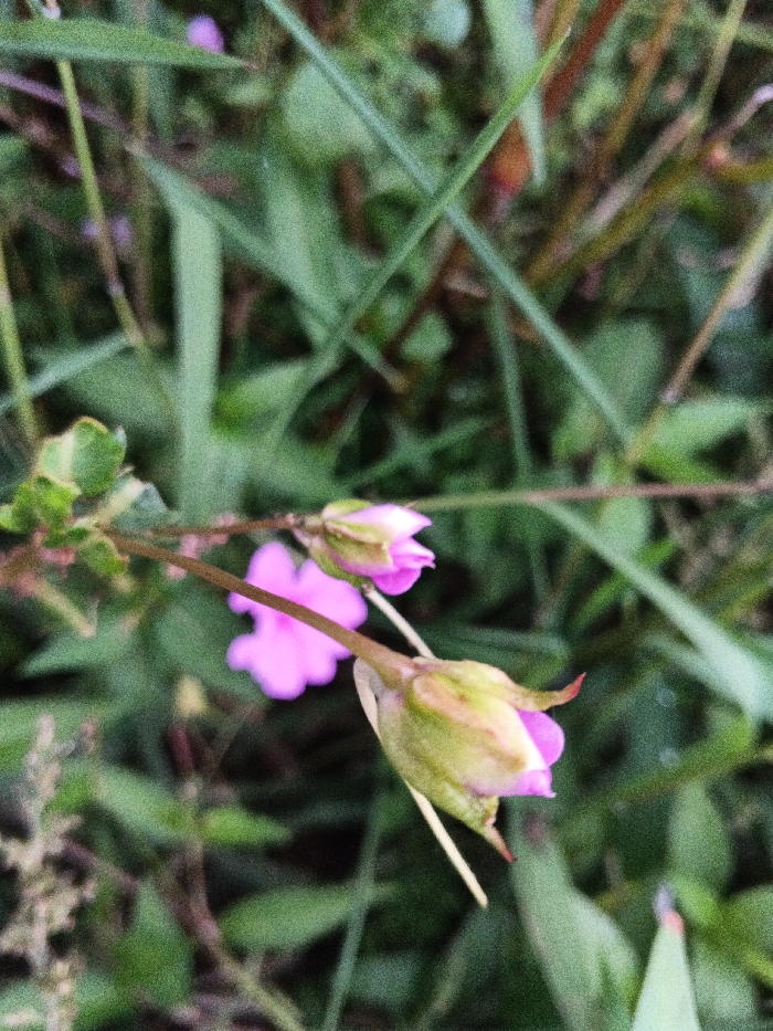 A close-up photograph taken in Pinnwe, Myanmar (Burma), displays a natural outdoor scene. The foreground features two developing flower buds. The lower bud, positioned centrally, is primarily light green with visible pink petal tips emerging. It is attached to a slender brown stem that extends towards the upper left. A second, smaller bud with similar characteristics is visible above and slightly to the right of the lower bud, also on a thin stem. In the mid-ground, a partially open, unfocused light pink flower is visible to the left of the prominent lower bud. The entire scene is set against a blurred background composed of dense green foliage, including various blades of grass and leaves, with some reddish-brown plant elements interspersed. No human subjects or man-made objects are present.