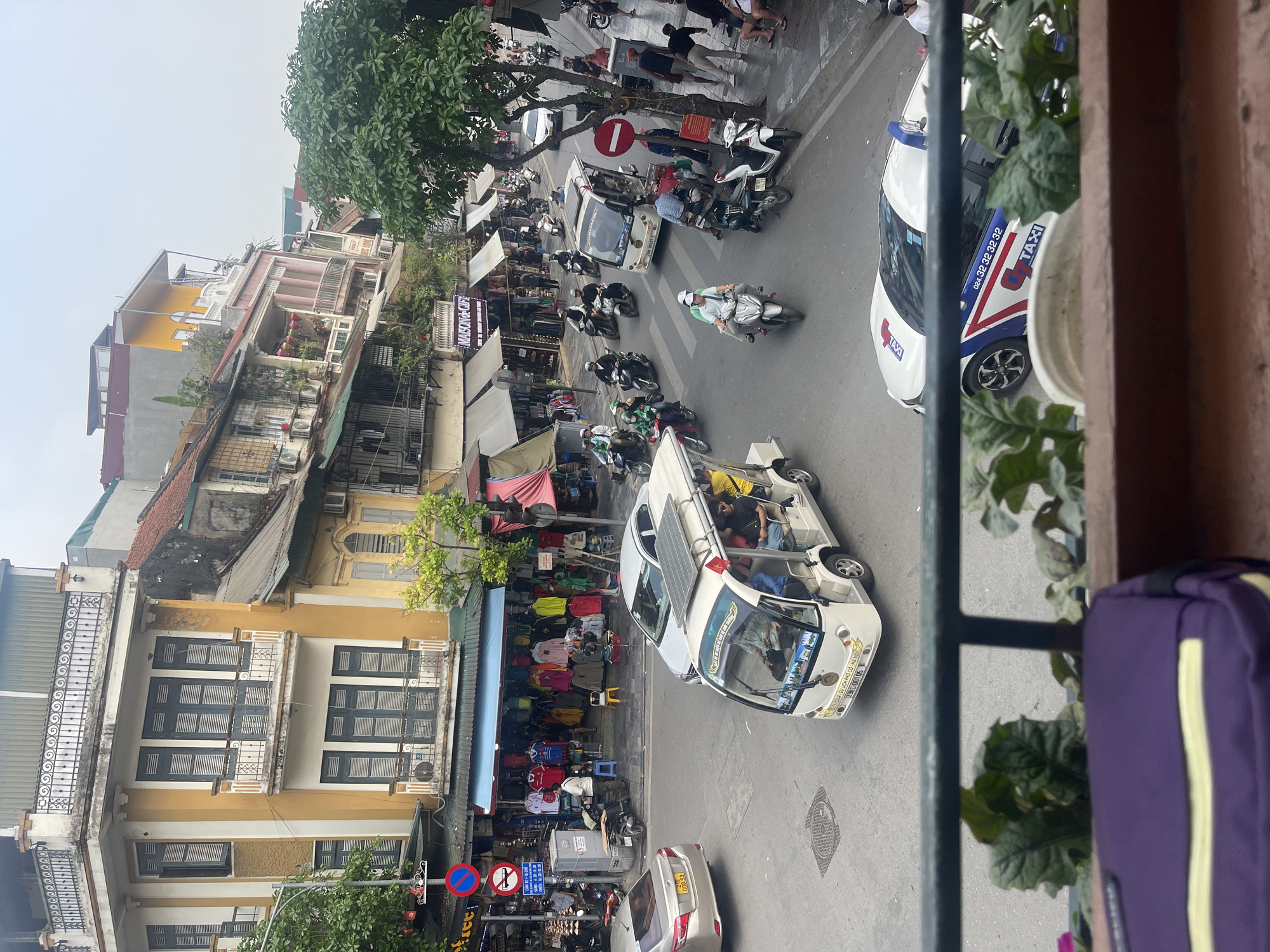 This eye-level, vertical-format photograph captures a bustling street scene in Hà Nội, Vietnam. The vantage point appears to be from an elevated position, possibly a balcony or window, overlooking the intersection. Several types of vehicles populate the street, including scooters, a "Tour du lịch phố cổ Hà Nội" electric vehicle with passengers, and a Taxi. Pedestrians are also visible, some walking along the sidewalk and others seemingly crossing the street. Buildings line the street, displaying a mix of architectural styles, including colonial-era architecture with shuttered windows. Some of the buildings host businesses, as indicated by signs and awnings. Street vendors are operating, selling various items, including clothing. Traffic signs are visible, indicating traffic regulations. Foliage from nearby plants, visible on the right, frames the scene.