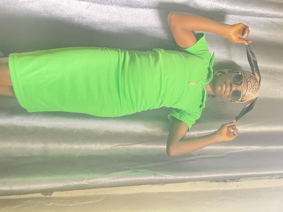 A woman lies on her back against a silver, textured surface. She wears a bright green, short-sleeved dress and large, square sunglasses. A patterned headscarf covers her hair, and she holds its ends playfully in each hand. A gold necklace with a small pendant adorns her neck. The scene is illuminated, creating a hazy effect.