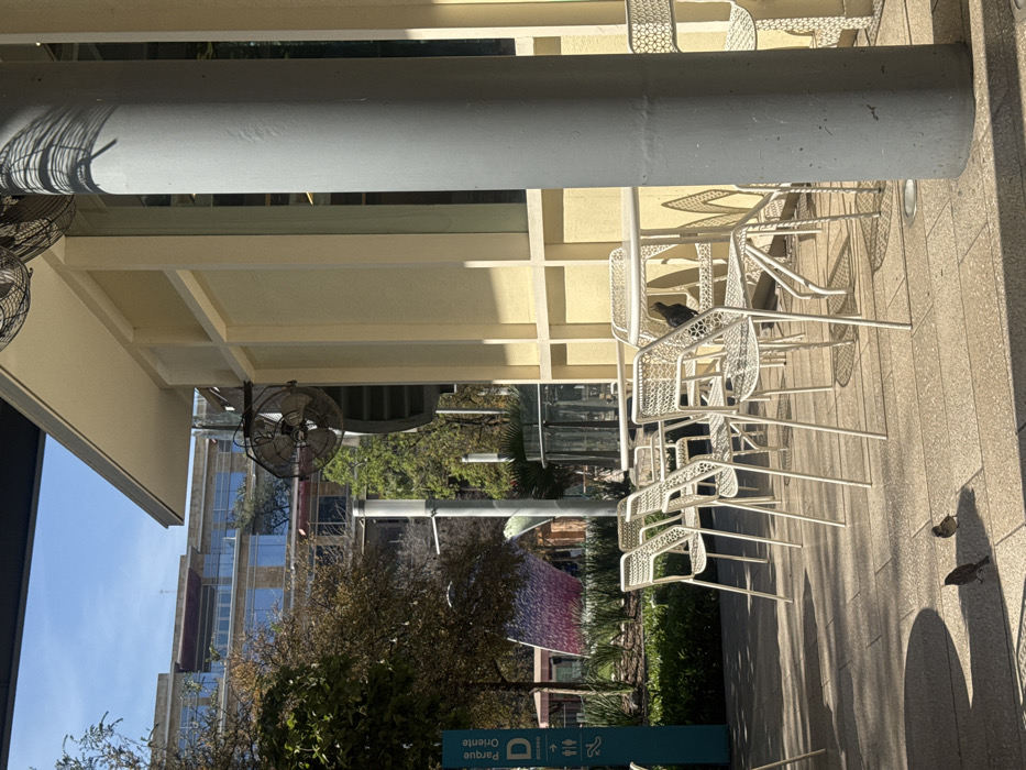 Outdoor café seating featuring white metal chairs and tables is partially shaded by a beige awning. A pigeon perches on a chair while two sparrows are on the paved ground nearby. A ceiling fan is visible above the seating area. The backdrop reveals city buildings, trees, and signage for "Parque Oriente". The scene is captured in daylight with visible shadows.