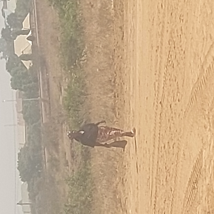 An elderly woman walks along a sandy path next to a grassy area. She wears dark clothing and a patterned skirt. The sandy path shows tire tracks. In the distance are buildings and trees obscured by a hazy atmosphere. The picture is angled, tilting to the right.
