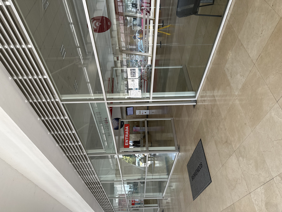 A modern building's entrance features glass walls and a door labeled "Entrada" (Entrance). A gray mat with "Bienvenidos" (Welcome) lies on the tiled floor. Reflections reveal a bright interior and ceiling details. The view through the glass includes furniture and other people inside. The architectural style emphasizes transparency and accessibility.