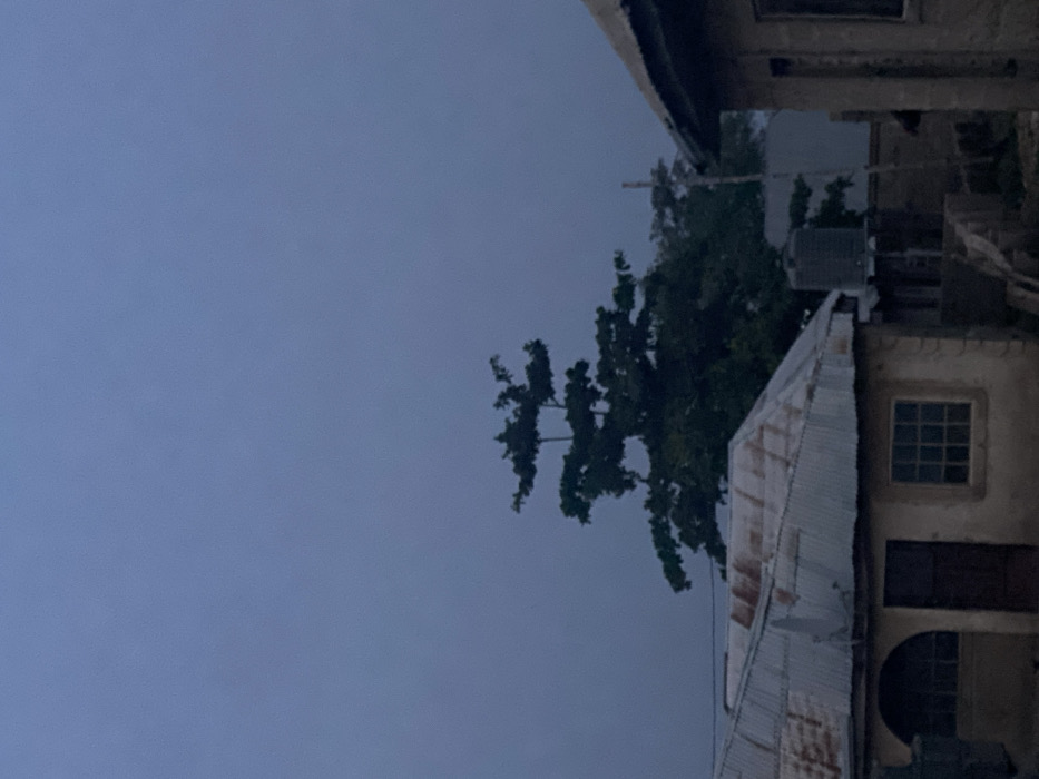 The image depicts a residential scene in Zango-ndaji, Nigeria, under an overcast or low-light sky. The sky, occupying the upper two-thirds of the frame, is a uniform greyish-blue. A large, dark green tree with tiered foliage stands centrally, its top branches silhouetted against the sky. In the lower-left, a single-story building with light-colored, possibly rendered, walls is visible. It features a rusted corrugated metal roof, upon which a white satellite dish is mounted on the left side. The building has a dark, arched entryway on its left and a rectangular window with multiple small panes on its right. To the right of the central tree, a black cylindrical water storage tank is visible at ground level. A slender, vertical wooden pole stands near the tank. The corner of another building with light-colored walls and a dark roof is partially visible on the far right edge of the frame. No individuals are present in the scene.