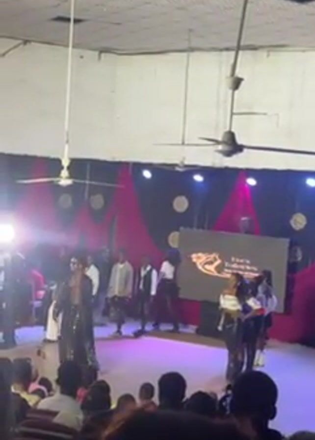 A fashion show is underway indoors with an audience watching models on a stage. The stage is decorated with pink curtains, black fabric, and large golden circles. A screen displays the name "Faye's Transformation". A male model in a black outfit with embellishments walks confidently, while other models stand behind him. The audience is visible in the foreground. There are multiple ceiling fans visible.