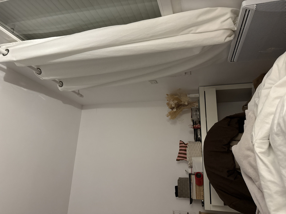 A bright room features a white ceiling and walls. A multi-layered, white fabric structure is suspended from the ceiling, appearing almost like a canopy. A white air conditioning unit is mounted on the ceiling. A white shelving unit is positioned against the wall, displaying various items including pillows, a basket, and a dried floral arrangement. A large, brown, rounded object, possibly a pillow or beanbag, rests near the shelves. A white blanket or sheet dominates the lower right portion of the frame.