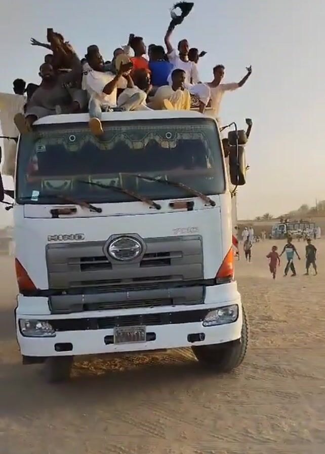 Here's a concise description of the video: The video shows a white Hino truck driving across a dusty area. The truck is packed with people, many of whom are on the roof or in the truck bed, waving their arms and appearing to celebrate. Some of them are holding objects. There's a crowd of people visible in the background, and the sky is clear. The atmosphere seems lively and celebratory.