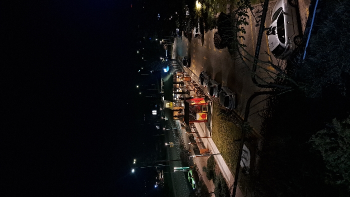 The scene depicts a commercial area at night, observed from an elevated perspective in the city of Unknown, Unknown