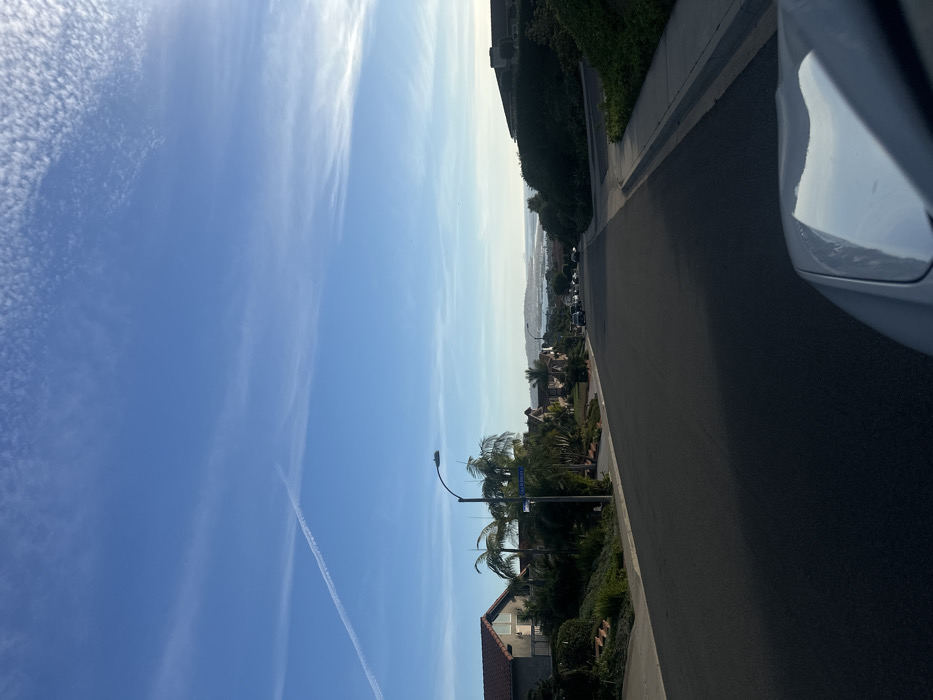A sunny suburban street scene shows a road curving downhill with houses on the side, interspersed with palm trees. The sky is a clear blue with wispy clouds and a prominent contrail. A car partially obstructs the view on the right. The distance shows a hint of a coastal view, suggesting a location near the ocean. Lush greenery and well-maintained landscaping line the street, giving off an affluent impression.