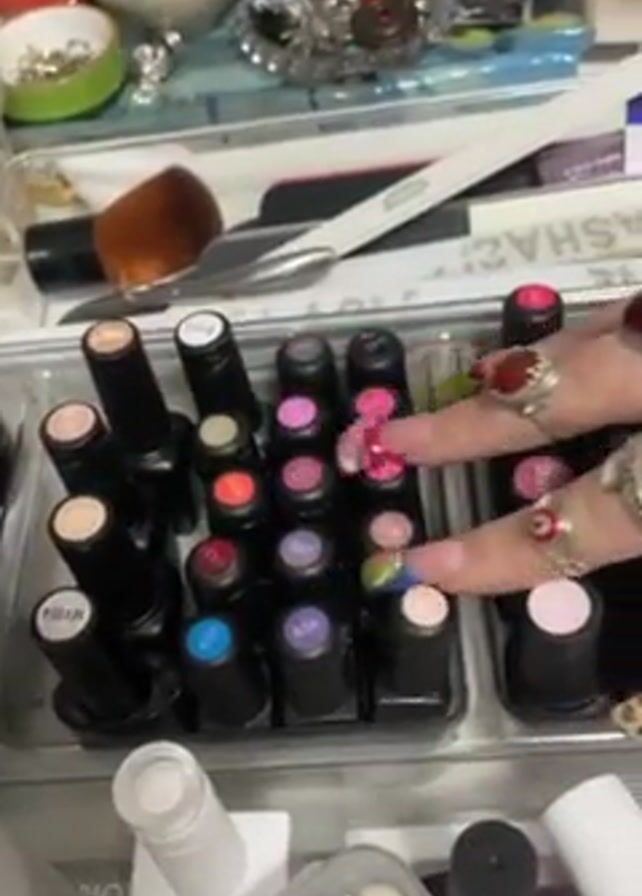 person’s hands sorting through a selection of nail polishes in a clear plastic container. The container is divided into compartments, each holding multiple bottles of nail polish in various colors. Above the container is a collection of jewelry, including rings and earrings, along with other beauty-related items like brushes and tools. The person is wearing multiple rings on each finger and has intricate nail art with designs like eyes and patterns. The environment appears to be a well-lit workspace, possibly a dressing table or a professional nail salon setup. The person moves their hands to shuffle and arrange the bottles, showing off the diverse range of nail polish colors and the tools available. The overall scene suggests a collection of beauty products organized in a personal space.
