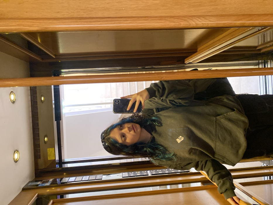 A young adult female is depicted taking a mirror selfie inside what appears to be an elevator or a mirrored lobby in Gijón/xixón, Spain. The specific location within Gijón/xixón cannot be determined from the image. The subject is positioned with her right side slightly turned towards the mirror. She holds a dark-colored smartphone with a dual camera system in her right hand, pointed at the mirror to capture her reflection. Her left hand rests on a polished wooden handrail. She has dark, wavy hair with visible teal or blue highlights, and dark sunglasses are pushed up onto her head. She wears a dark gray or faded black hooded sweatshirt with a front kangaroo pocket, featuring a light-colored, abstract graphic on the chest. Dark trousers are partially visible below the sweatshirt, along with a dark backpack worn over her left shoulder. The immediate environment features a large mirror reflecting the subject. To the left of the subject's reflection, an elevator control panel with multiple buttons is visible on a light-colored wall or panel. The area surrounding the mirror includes polished wooden panels, particularly prominent on the right side. The ceiling within the reflected space shows several circular recessed lights. Through an opening visible in the reflection (likely an open elevator door or a doorway in the background), an interior building hallway with a light-colored staircase and dark handrails is discernible, illuminated by what appears to be natural light. The overall lighting is bright, combining artificial ceiling lights and ambient light from the reflected background.
