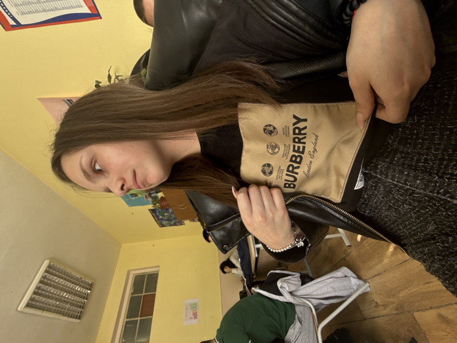 The image depicts a young female, likely a student, seated in what appears to be a classroom located in Cherven Bryag, Bulgaria. The subject, positioned centrally, has long, straight, medium-brown hair and is looking towards the left with a neutral expression. She wears a black long-sleeved shirt featuring a prominent rectangular beige patch on the chest displaying "BURBERRY London England" and three circular emblems. A partially unzipped black leather jacket covers the shirt. Her left hand, adorned with a white pearl bracelet, holds the jacket opening near her chest, while her right hand is visible further down near her waist. Her fingernails have a light-colored polish. The classroom environment features bright yellow walls, a light-colored ceiling with a rectangular fluorescent light fixture, and wooden floorboards. In the background, a high-set rectangular window with multiple panes is visible. Several other individuals are seated at wooden desks and chairs: one person in a green shirt and grey pants is on the left, another individual with dark hair is directly behind the main subject, and a third person is partially visible further back near the window. Wall decorations include a large blue poster or map, a small light-colored cabinet with a potted plant on top, a chart with colorful bars on the left wall, and a vertical white poster with text on the far right.