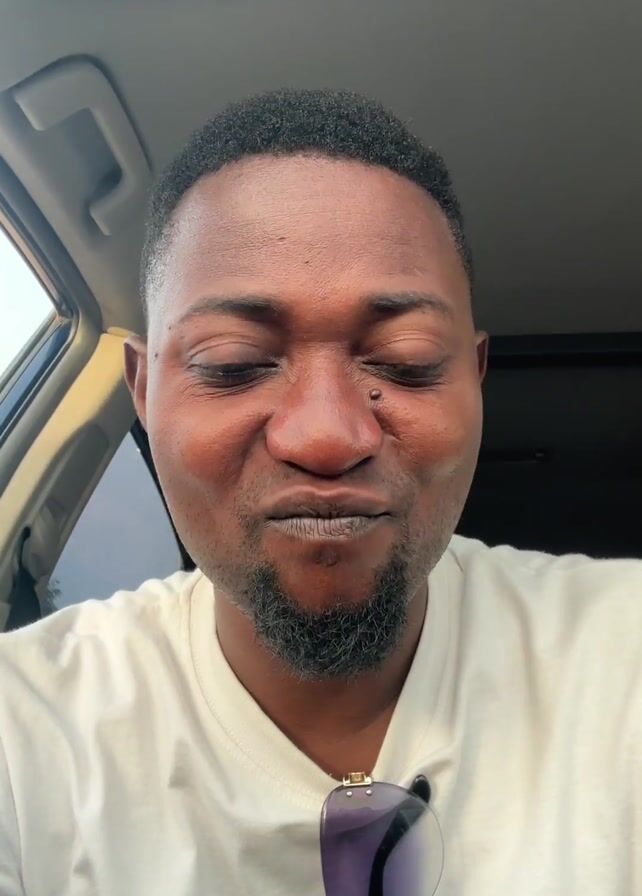A close-up shot shows a man in the driver’s seat of a car. He is wearing a white t-shirt, has dark hair and a beard, and a mole on his cheek. Sunglasses hang from the neck of his shirt. He makes a pouting face, then smiles broadly, revealing a missing tooth in the front. He then raises a finger and points toward the camera. The car interior is visible around him, with a grey headliner and other interior car components.