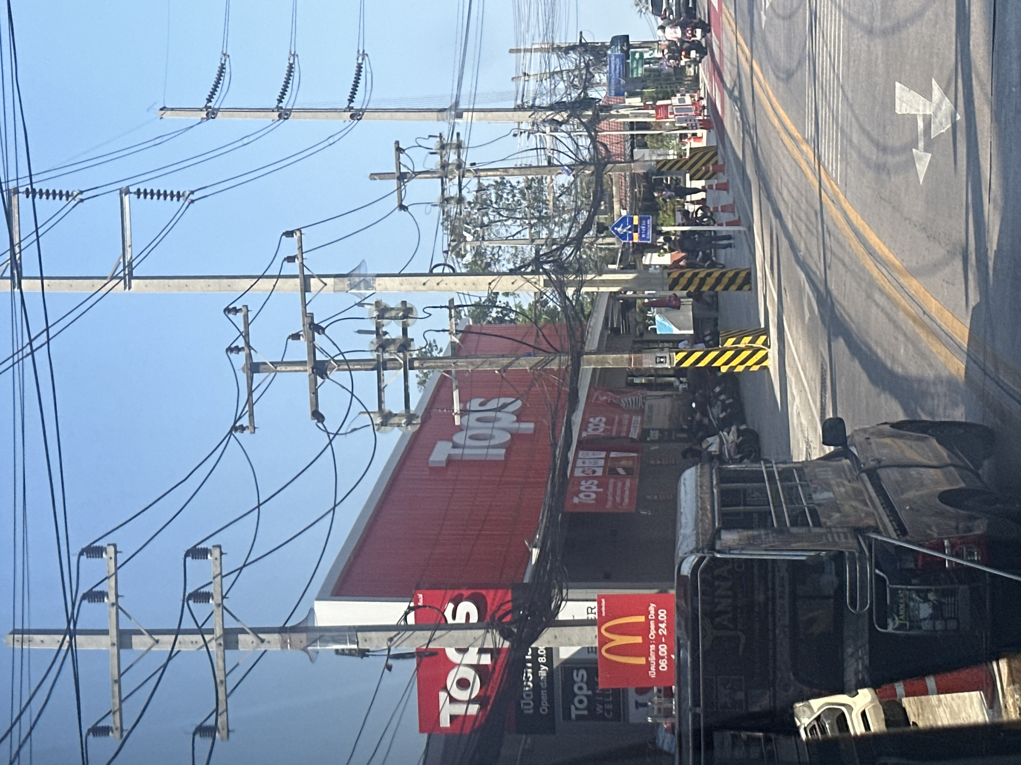 Here's a description of the image: The image shows a street scene in Pattaya City, Thailand, with a view oriented to the right and slightly upward. On the left side, there are several utility poles with a dense network of electrical wires dominating the sky. A "Tops" supermarket building is visible, with prominent signage and advertisements. There is also a sign for McDonald's (indicated by an "M") displaying the business hours of "06.00-24.00" in Thai. On the right side of the frame, a road with yellow lane markings is shown. An arrow indicating a right or straight path is painted on the road. Various pedestrians and motorcycles can be seen on the sidewalk. In the foreground, part of a vehicle, possibly a modified pickup truck or songthaew with "JANNA" written on it, is visible.