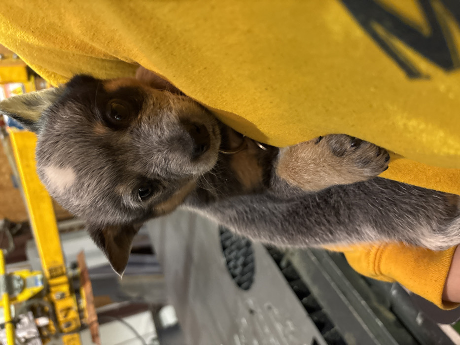 - "A blue-grey mottled puppy, consistent with an Australian Cattle Dog, is held vertically against a person's bright yellow long-sleeved garment" by FM-jc1Mt1, licensed under CC BY 4.0