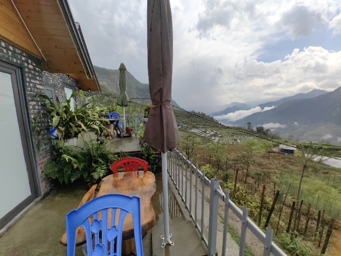 This image depicts an elevated outdoor patio in Tả Van, Vietnam, offering a view of a mountainous valley with terraced fields under a partially cloudy sky