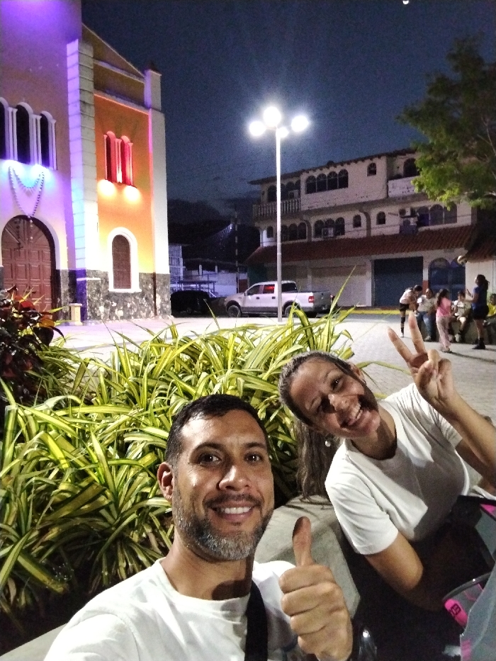 A man and woman pose for a selfie at night. The man is giving a thumbs up and the woman is making a peace sign. They are standing in front of a green leafy bush with a church behind them. The church is lit up with colorful lights and there is a street lamp in the background. People can be seen playing volleyball in the distance.