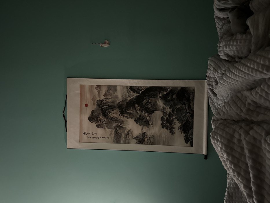 A Chinese-style landscape painting hangs on a teal wall. The artwork depicts mountains, trees, and mist in black and white, with a red sun. Above the painting is a patch or repair on the wall. A textured white blanket or comforter partially obscures the right side of the image.
