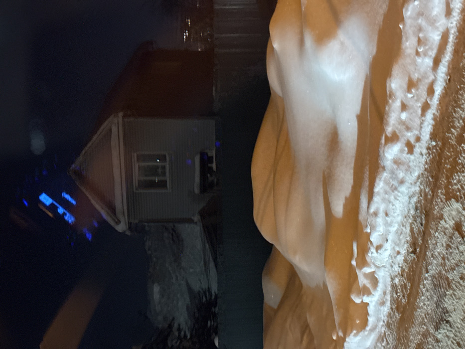 A nighttime scene captures a building with a reddish-brown roof and gray siding, featuring a window. The structure appears partially reflected in dark water. Adjacent to this, a large, amorphous mass of white, possibly snow or ice, dominates the right side. The ground beneath it is speckled with white, contrasting against the overall darkness. Reflections of blue lights are also visible. The image is rotated to the side.