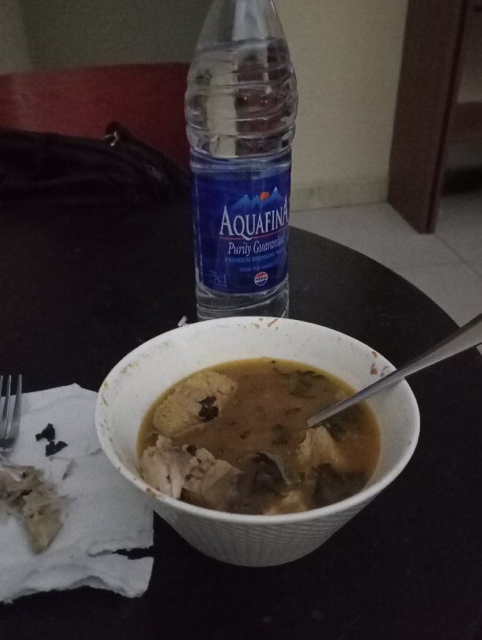 An indoor scene in Gwarinpa, Nigeria, displays a meal setting on a dark, flat surface, likely a table. Prominently centered is a clear plastic Aquafina water bottle, 75cl, with its blue label clearly visible, indicating "Purity Guaranteed" and a Pepsi logo. To the lower right of the bottle sits a white, textured bowl containing a light brown or yellowish soup or stew. The liquid contains numerous irregular chunks of light-colored protein, likely meat or fish, along with scattered dark green vegetable matter. A silver spoon is partially submerged within the soup. To the lower left, a crumpled white paper napkin rests on the table, supporting a silver four-tined fork. The napkin also bears several small, dark, irregular fragments and some lighter, fibrous remnants, indicating discarded food debris. The background is blurred and dimly lit, revealing a reddish-brown object, possibly furniture, on the left, a light-colored wall, and a dark vertical architectural element on the right. No individuals are present in the frame. The arrangement of items suggests a meal in progress or recently concluded.