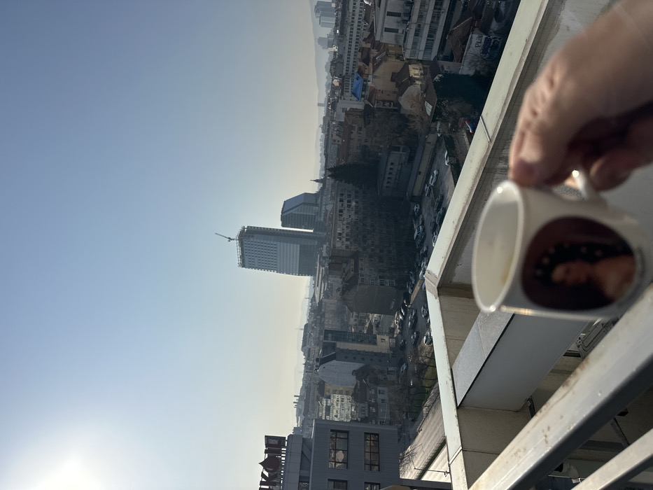 The image depicts an elevated view of Sofia, Bulgaria, looking southeast towards the Tsarigradsko shose Blvd area. In the immediate foreground, a right hand holds a small white espresso cup containing a light brown liquid. The cup features a printed portrait of a woman, possibly Empress Elisabeth ("Sisi") of Austria. The hand and cup are positioned above a light-colored balcony railing, which runs diagonally across the lower left of the frame. The mid-ground reveals a dense urban landscape characterized by a mix of residential and commercial buildings, predominantly low-rise structures with varying architectural styles and facades. A street or road is visible, along with multiple parking lots containing numerous vehicles. Sparse, deciduous trees, indicative of winter, are scattered throughout the cityscape. On the far left, a partial view of a building with a red "KOKA" (likely Coca-Cola) sign is visible. In the background, two prominent modern skyscrapers dominate the skyline. The taller building, Sky Fort, is under construction, evidenced by a visible crane on its roof and scaffolding around its upper sections. Adjacent to it on the right is the completed, angular, glass-clad Capital Fort building. Beyond these structures, a hazy silhouette of distant mountains or hills is present on the horizon. The sky is clear and bright blue, with the sun intensely bright in the upper left quadrant, casting long shadows across the urban environment.