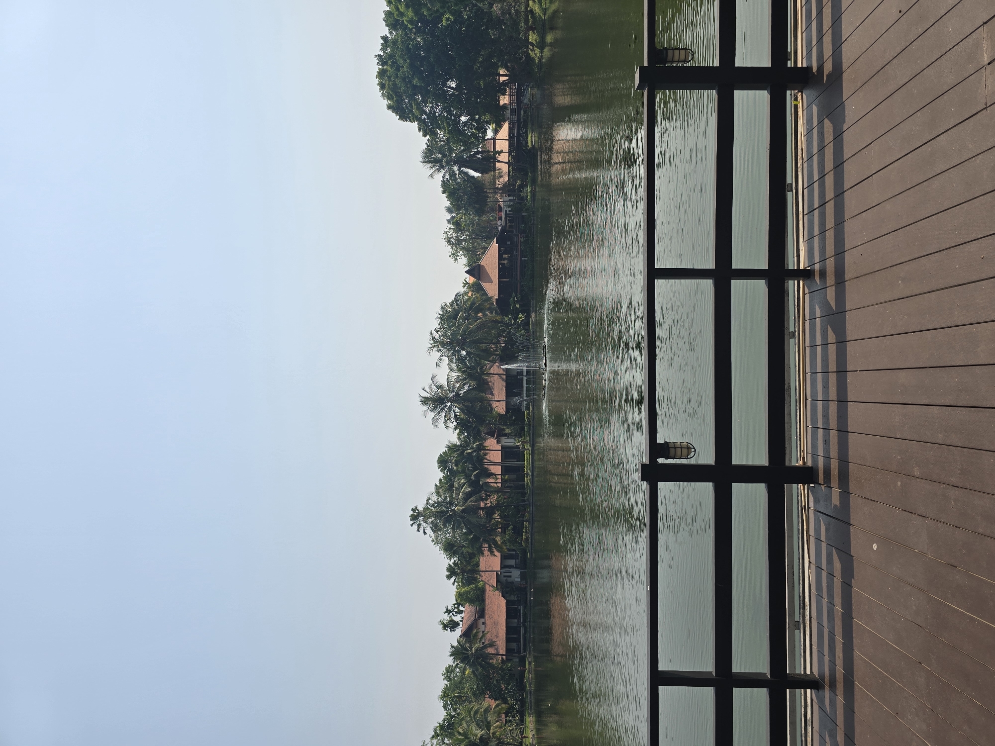 The image depicts an outdoor scenic view across a body of water, located in Ban Phaya Kot Ana Kaeo, Thailand. In the foreground, a dark brown wooden deck with parallel planks is visible, featuring a black wooden railing that spans the lower third of the frame. An industrial-style wall sconce with a cage cover is affixed to a vertical post of the railing on the right. The midground features a calm, dark green body of water, exhibiting minor surface ripples and a multi-jet water fountain actively spraying near the left-center. The background reveals the far bank lined with several buildings characterized by reddish-brown tiled roofs and lighter-colored walls, largely integrated within a dense landscape of green tropical foliage, predominantly palm trees. A small bridge extends across a section of water or land on the right side of the far bank. The upper portion of the image is dominated by a clear, pale blue sky. No human or animal subjects are present. The scene is brightly illuminated by natural light, casting distinct shadows from the railing onto the deck.