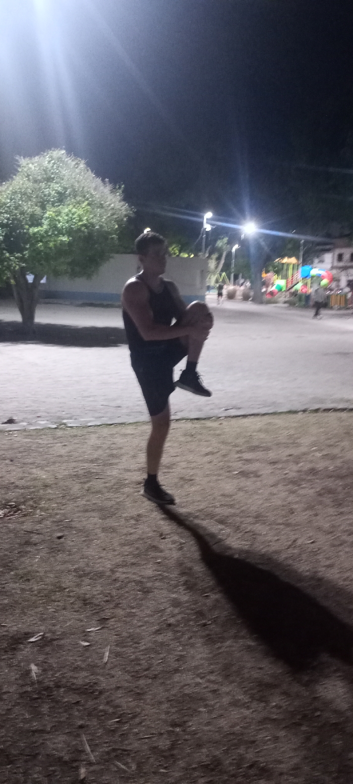 A person in athletic wear performs a standing knee-to-chest stretch outdoors at night. The individual is on a ground that appears to be a mixture of dirt and grass, with a long shadow cast by an unseen light source. In the background are trees, streetlights, and a brightly lit area that looks like a playground or gathering space, with a few other figures in the distance. The overall scene is illuminated, but details are somewhat obscured by the low lighting conditions.