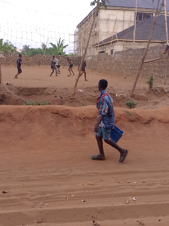 A dusty outdoor scene reveals a boy in a colorful shirt and denim shorts walking along a dirt road, carrying a blue container. In the background, a group of young men play soccer within a makeshift court enclosed by a net and wooden poles. A partially constructed building with scaffolding stands tall behind a brick wall. The overall setting suggests a rural or developing community.