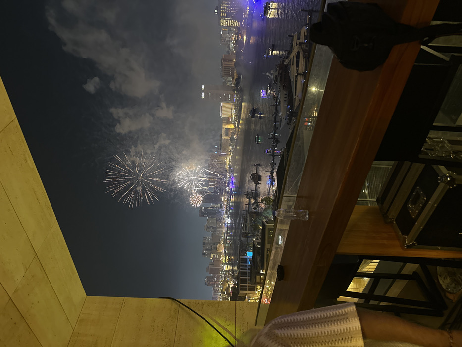 A nighttime view showcases fireworks exploding above a cityscape and waterway. Tall buildings are illuminated along the water's edge, where boats are visible. The foreground features a partial view from an elevated position, including a wooden railing, a black backpack, and a glimpse of someone's white clothing. The overall ambiance is festive.