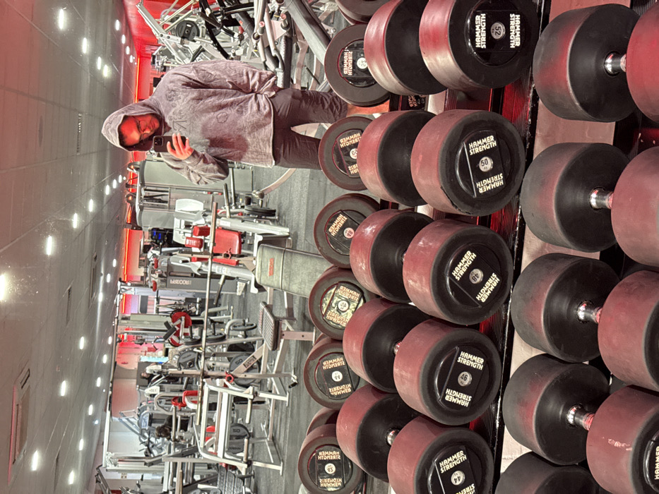 A male individual is depicted taking a mirror selfie within a gym setting in Mid Suffolk, United Kingdom