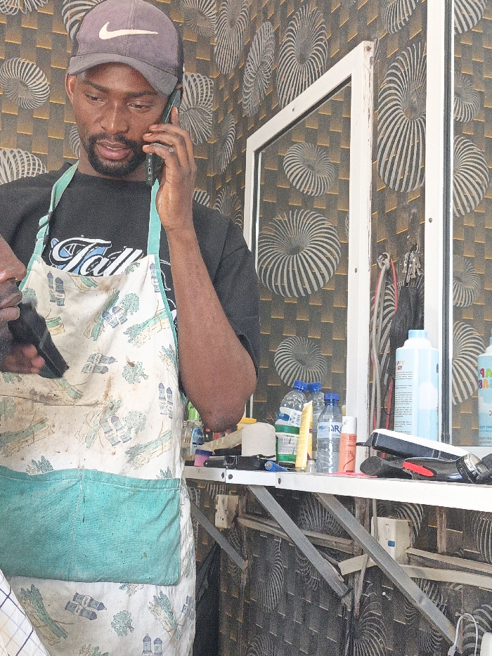 A male subject is depicted mid-shot in what appears to be a barbershop or salon in Gwagwarwa, Nigeria