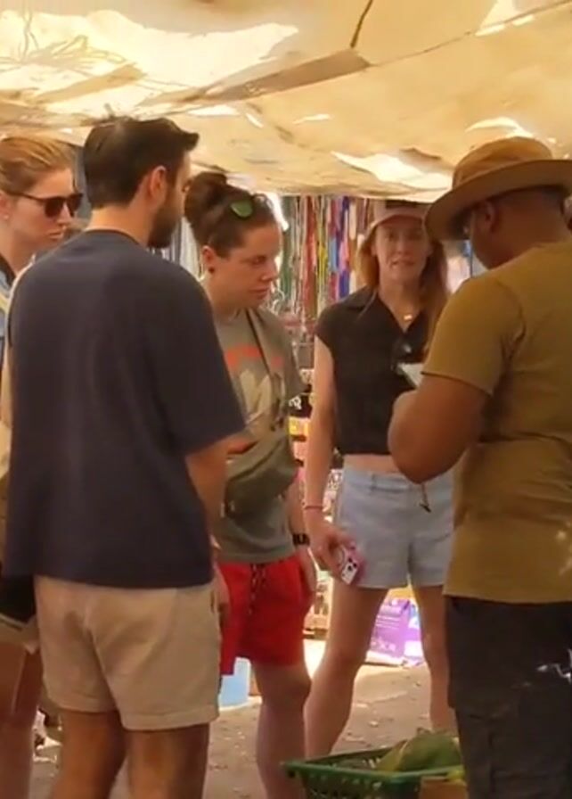 The scene takes place in a bustling outdoor market under a makeshift canopy. A group of six fair-skinned people, possibly tourists, are gathered around a dark-skinned man wearing a hat and olive green shirt. The man appears to be explaining something, possibly taking notes or showing something on his phone. The tourists are dressed casually in shorts and t-shirts. To the left of the group, a woman with a colorful headscarf is holding a bag and some green fruit, presumably a vendor at the market. Behind the group, there are stalls selling various goods, including fruits, vegetables, cookware, and other items. The overall atmosphere is lively and crowded, typical of a market setting.