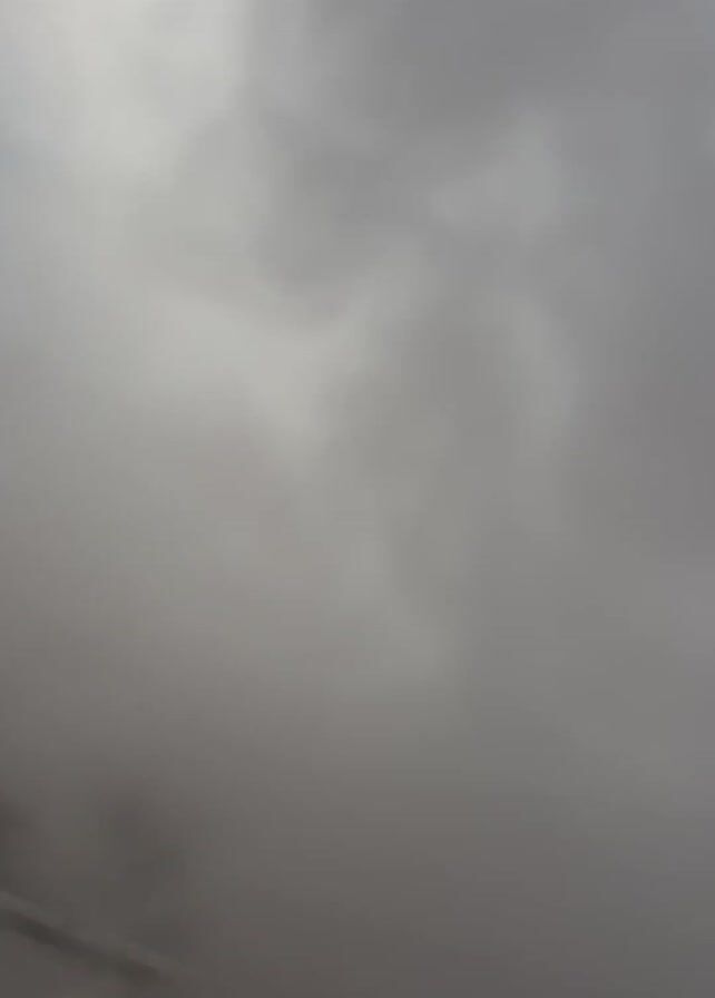 The video begins with a slightly elevated view of a suburban neighborhood on a sunny day with scattered clouds. Mist or smoke momentarily obscures the view. A light-colored car with a dark sunroof is parked on the street below. There are houses with varying roof colors and a walled yard visible. The video then transitions to an obscured view before returning to the original scene of the neighborhood.