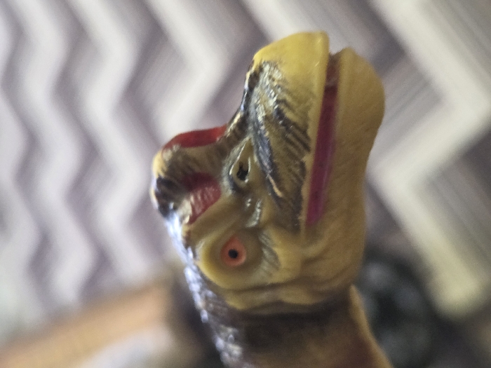 The image presents a macro-level, frontal-profile view of a toy dinosaur's head