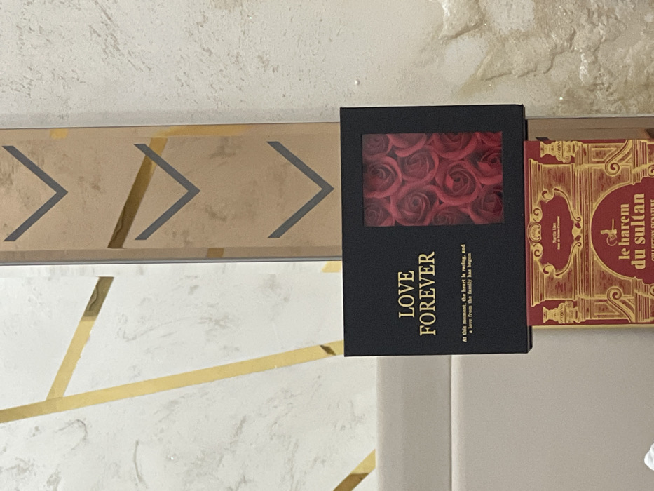 This indoor scene is located in Omurtag, Bulgaria. The central focus is a stack of two rectangular boxes. The upper box is black, featuring gold text "LOVE FOREVER" on the left, below which is smaller text reading "At this moment, the heart is racing, and a love from the family has begun." To the right of this text, a rectangular window reveals a densely packed arrangement of red rosebuds. Directly beneath, a red box with intricate gold decorative elements is visible, displaying the gold text "le harem du sultan." The background to the left of the boxes includes a light-colored, possibly upholstered, surface transitioning into a white wall decorated with abstract gold lines. To the right of the boxes, a vertical, reflective panel with a bronzed or muted metallic finish is present, exhibiting three uniformly spaced grey chevron patterns pointing downwards. Further to the right, a textured, light-colored wall, possibly white or off-white, with a subtle sparkle, completes the background. No individuals or dynamic actions are depicted; all objects are stationary.