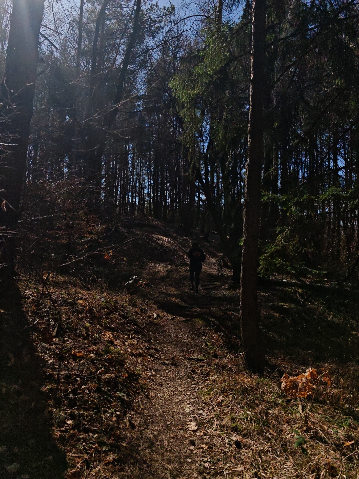 The image displays a forest trail located in Rudartsi, Bulgaria, under daylight conditions. A single individual, wearing dark clothing, is observed walking uphill on a narrow, earthen path that traverses the center of the frame, leading towards the background. The ground is covered with dried leaves, sparse grasses, and exposed soil. Dense coniferous and deciduous trees line both sides of the path, casting significant shadows across the scene. Sunlight filters from the upper left, illuminating portions of the ground cover and tree canopies. A clear blue sky is visible through gaps in the upper tree line. A prominent tree trunk stands vertically in the mid-right foreground, with another partial trunk on the far left.