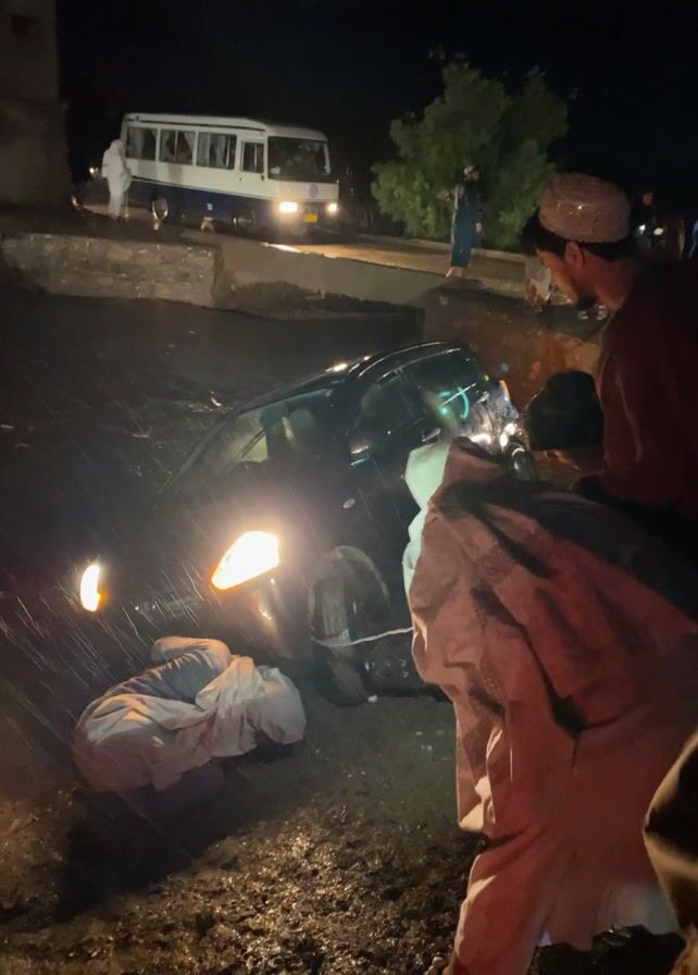 A dark-colored car has crashed at night, its headlights shining on a bundled figure lying nearby. People huddle around, some wearing head coverings, their faces reflecting concern. A bus sits parked in the background, its presence hinting at a possible larger incident or evacuation. The scene is dimly lit, accentuating the urgency and gravity of the situation as bystanders grapple with the aftermath of the car crash.