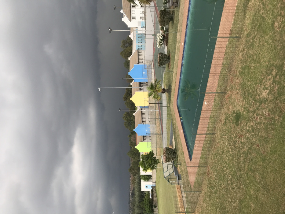 The image depicts an outdoor recreational area and residential complex in Midrand, South Africa, under a heavily overcast, dark gray sky. In the foreground, a rectangular swimming pool with greenish water is visible, bordered by a light brown brick coping and enclosed by a green wire mesh fence. Two small yellow objects float on the pool's surface. Adjacent to the pool, a patch of green and dry grass extends. To the left of the pool area, a small, low-profile structure with a green roof is partially visible behind another section of fencing, suggesting a utility cover or shelter. In the midground, beyond the pool and grass, two tennis courts with green and red surfaces are visible, separated by fencing. A small palm tree stands between the tennis courts and the pool area, with various green bushes and white flowering plants strategically placed. Several tall, multi-headed light poles are erected around the tennis courts and behind them. The background features a row of two-story residential buildings or townhouses. Several of these structures display vibrant, distinct exterior paint colors, including lime green, bright blue, and yellow, interspersed with white and light blue units. They feature light-colored, possibly tiled, pitched roofs. A fence separates these buildings from the recreational facilities. Beyond the residential structures and trees, a distant flat horizon is discernible under the dark, heavy storm clouds. No individuals are visible within the scene.