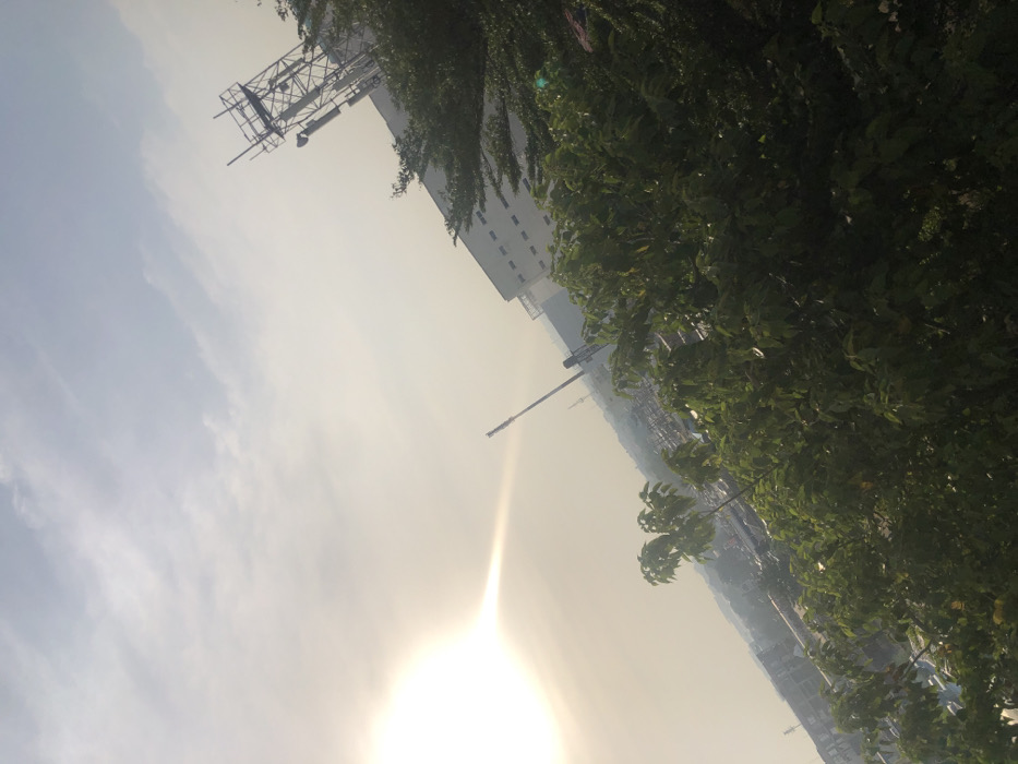 This image captures an elevated, angled view of an urban or industrial landscape within Abuja, Nigeria, under a bright and hazy sky. The sun, a prominent luminous source, is positioned in the upper-left, casting a strong light streak across the pale sky, which shows diffuse cloud patterns. The foreground is dominated by dense green foliage, appearing as trees or large bushes, extending across the bottom and up the right side of the frame. In the midground, a light-colored, multi-story building with visible dark, rectangular openings is situated behind the foliage on the right. Above this structure, a metallic lattice telecommunication tower, equipped with multiple platforms and antenna apparatus, rises prominently against the sky. Further into the hazy background, a sprawling expanse of urban or industrial development is discernible, featuring numerous indistinct structures and at least one additional slender mast. No human subjects or specific actions are visible within the frame.
