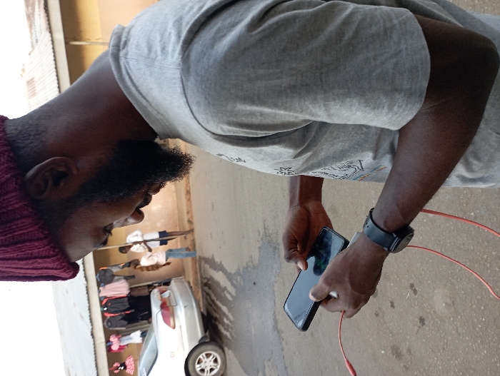 The image captures an outdoor street scene in Jos, Nigeria. In the immediate foreground, a dark-skinned male subject, seen in profile from the right, wears a maroon knit beanie and a grey short-sleeved t-shirt. He has a beard and is looking down intently at a black smartphone held in both hands, with his right thumb positioned on the screen. A black wristwatch is visible on his left wrist, and a red cable, likely for charging or earphones, extends from the phone. In the background, a silver sedan car is parked to the left. Behind the car and to the right, a building with a grey corrugated metal roof features an outdoor clothes display, showing various garments including dresses, jackets, and shirts hung on a rack. Further back, two individuals, appearing to be young males, are visible; one wears a light-colored shirt and holds a stick. The ground surface is paved, indicative of a street or market area.