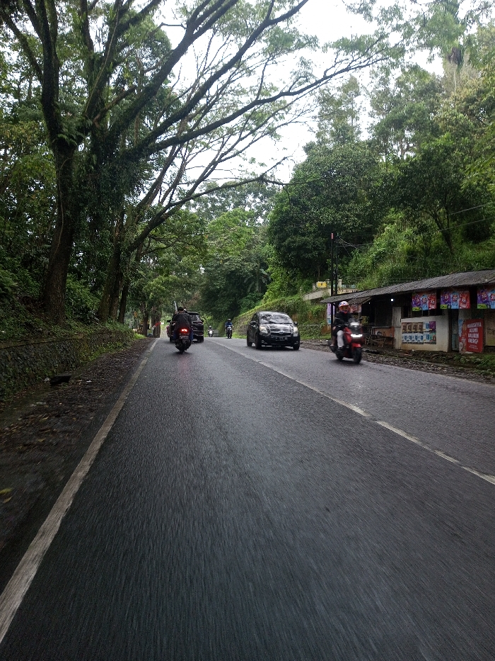 The image displays a two-lane asphalt road in Serpang Shalli, Bhutan, under an overcast sky, appearing damp from recent precipitation. A solid white line marks the left edge of the road, and a dashed white line separates the two visible lanes. On the left side of the road, a low stone retaining wall borders a strip of dark earth, beyond which a dense line of large trees with sprawling, moss-covered branches creates a canopy. Lush green foliage and undergrowth are visible behind these trees. In the left lane, traveling away from the viewer, are a dark-colored motorcycle with a rider in dark clothing and a helmet, followed by a dark car. Another motorcycle is visible further ahead in the same lane. In the right lane, traveling towards the viewer, is a red scooter with a rider wearing a white cap and a dark jacket, followed by a dark-colored hatchback with its headlights illuminated. A fourth motorcycle is visible further ahead in the right lane, also traveling away. On the right side of the road, a rudimentary single-story structure with a corrugated roof functions as a roadside stall or shop. Its front wall displays several colorful posters, some bearing visible text in a non-English language, including phrases such as "PULSA, DATA, TOKEN PLN" and "ENERGI." Behind this structure and continuing into the background, a steep hillside is covered in dense green trees and vegetation.