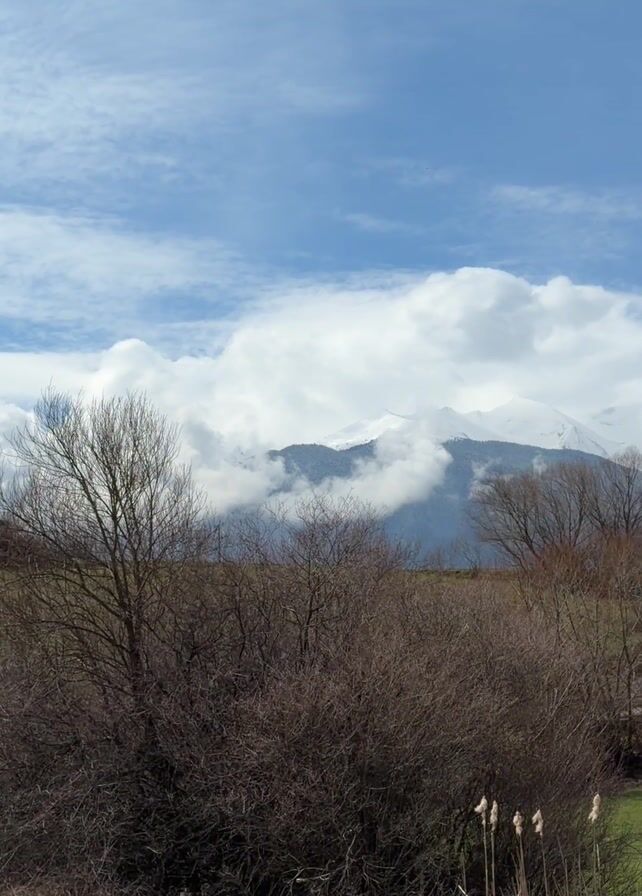 landscape view with a blue sky partially covered with fluffy white clouds. In the background, there's a mountain range with snow-covered peaks partially obscured by the clouds. The foreground consists of a field of green grass, some bare trees, and several bushes without leaves. The overall impression is of a rural, scenic environment. There are no people, animals, or any specific actions occurring.
